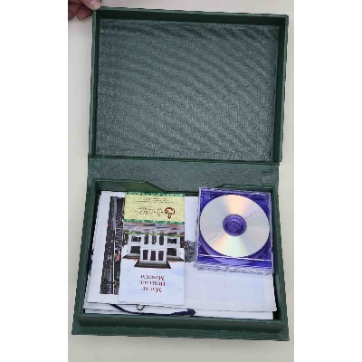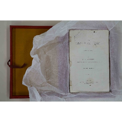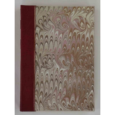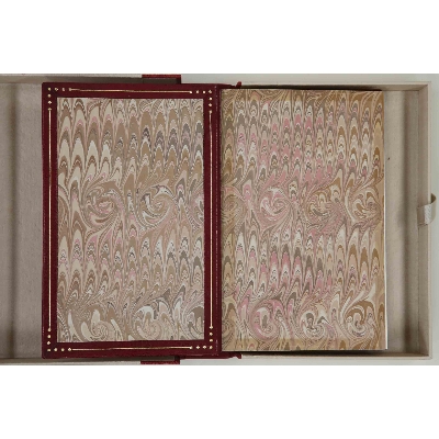 Cloth slip case on book board, book case with goat skin leather covered, leather onlay of a laying press, ivory inlaid bone folder, marbled book end paper, eel skin leather board lining . The Chemise is cloth covered matching the skip case with hand marbled paper linings.
