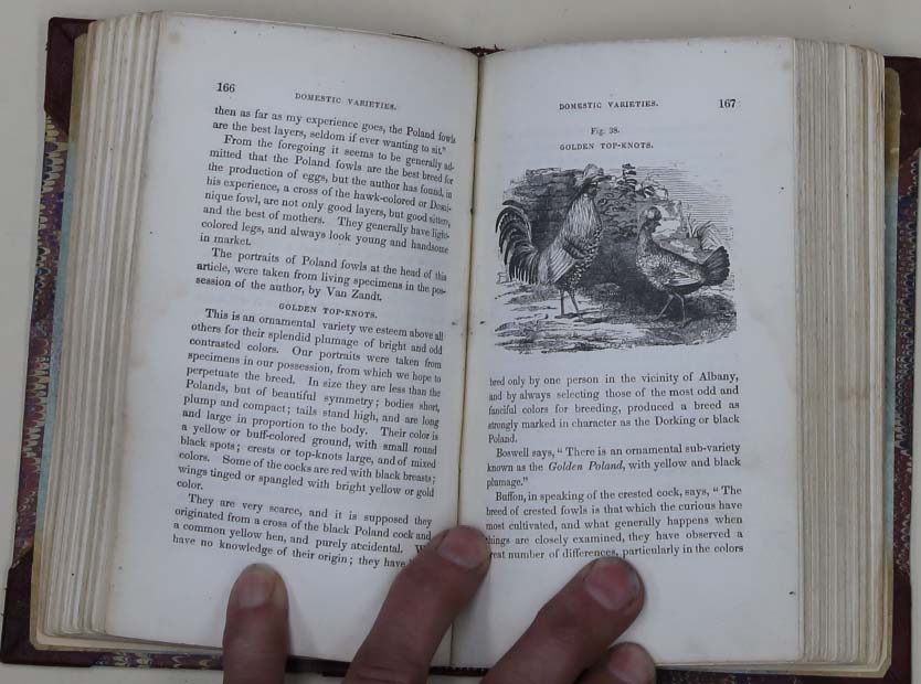 I also had some volumes of Poultry Tribune with singed spines, and also a copy of Bement American Poulterer's Companion , that came with the collection. The Bement was soaked during the fire, into a solid block, and I decided to “learn” something of such a restoration. I soaked of each page from the block, with a total loss of less than half a page of text from the whole book. Then resized all the pages, and rebound to a nice volume, a little stiff in the opening and lacking finesse, but much treasured for the results and all I learned.. I had the pleasure of showing John many years later before he passed.